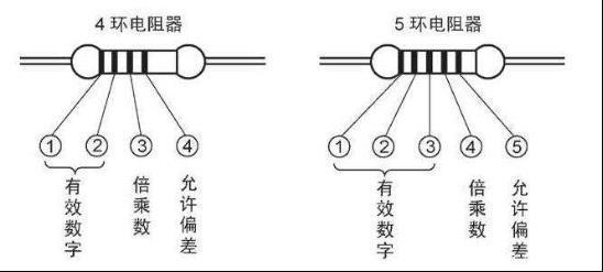 2、色环标注法使用最多,第一道色环表示阻值的最大一位数字,第二道色环表示第二位数字,第三道色环表示阻值未应该有几个零,第四道色环表示阻值的误差。